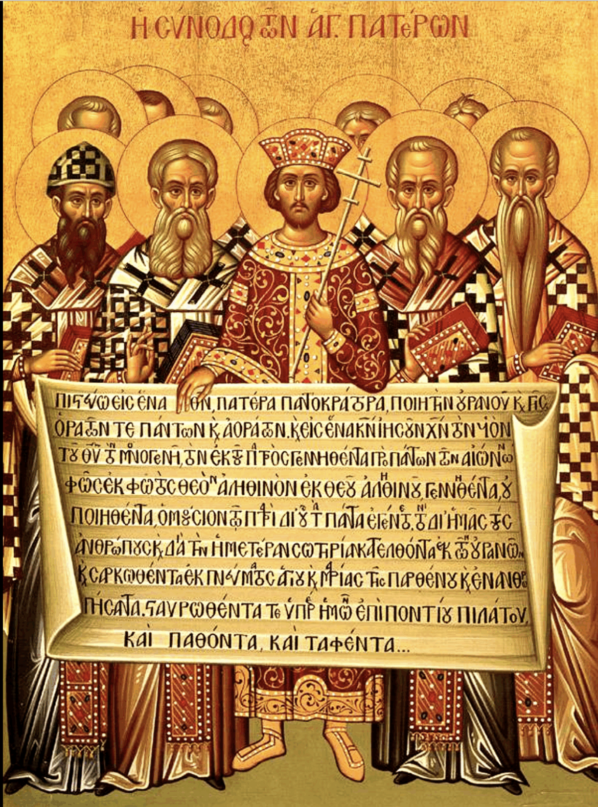 | 1. Πιστεύω εἰς ἕνα Θεόν, Πατέρα, Παντοκράτορα, ποιητὴν οὐρανοῦ καὶ γῆς, ὁρατῶν τε πάντων καὶ ἀοράτων.2. Καὶ εἰς ἕνα Κύριον Ἰησοῦν Χριστόν, τὸν Υἱὸν τοῦ Θεοῦ τὸν μονογενῆ, τὸν ἐκ τοῦ Πατρὸς γεννηθέντα πρὸ πάντων τῶν αἰώνων· φῶς ἐκ φωτός, Θεὸν ἀληθινὸν ἐκ Θεοῦ ἀληθινοῦ, γεννηθέντα οὐ ποιηθέντα, ὁμοούσιον τῷ Πατρί, δι’ οὗ τὰ πάντα ἐγένετο.3. Τὸν δι’ ἡμᾶς τοὺς ἀνθρώπους καὶ διὰ τὴν ἡμετέραν σωτηρίαν κατελθόντα ἐκ τῶν οὐρανῶν καὶ σαρκωθέντα ἐκ Πνεύματος Ἁγίου καὶ Μαρίας τῆς Παρθένου καὶ ἐνανθρωπήσαντα.4. Σταυρωθέντα τε ὑπὲρ ἡμῶν ἐπὶ Ποντίου Πιλάτου, καὶ παθόντα καὶ ταφέντα.5. Καὶ ἀναστάντα τῇ τρίτῃ ἡμέρα κατὰ τὰς Γραφάς.6. Καὶ ἀνελθόντα εἰς τοὺς οὐρανοὺς καὶ καθεζόμενον ἐκ δεξιῶν τοῦ Πατρός.7. Καὶ πάλιν ἐρχόμενον μετὰ δόξης κρῖναι ζῶντας καὶ νεκρούς, οὗ τῆς βασιλείας οὐκ ἔσται τέλος.8. Καὶ εἰς τὸ Πνεῦμα τὸ Ἅγιον, τὸ κύριον, τὸ ζωοποιόν, τὸ ἐκ τοῦ Πατρὸς ἐκπορευόμενον, τὸ σὺν Πατρὶ καὶ Υἱῷ συμπροσκυνούμενον καὶ συνδοξαζόμενον, τὸ λαλῆσαν διὰ τῶν προφητῶν.9. Εἰς μίαν, Ἁγίαν, Καθολικὴν καὶ Ἀποστολικὴν Ἐκκλησίαν.