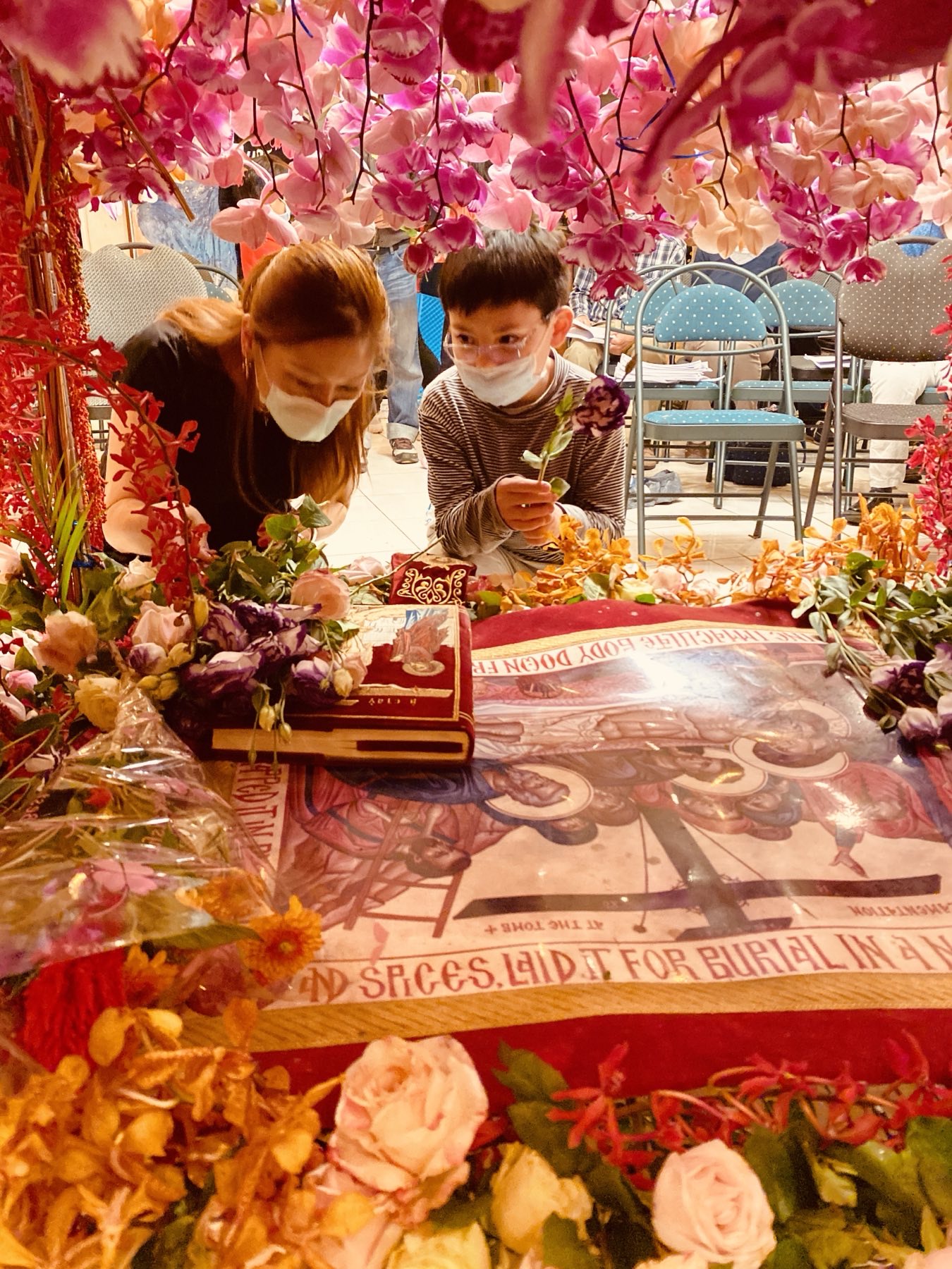 抹大拉的馬利亞、聖母馬利亞、愛的門徒約翰和亞利馬太的約瑟正準備將基督的屍體送往墳墓。聖像由 Athanasios Clark 提供,並經允許使用。Epitaphios Thrinos 的聖像由 Athanasios Clark 提供,並經允許使用。